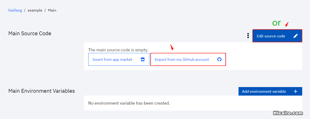 4、选择从 GitHUB 导入项目,当然如果你实在没有 GitHUB 账号,也可以在 GitHUB 将 6 个文件全部下载到本地,然后通过 Edit source code 将文件上传。
